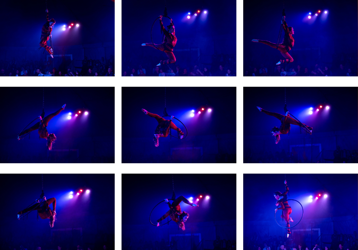 Anna Au Cirque es una serie fotográfica artística y documental que retrata dos semanas en la vida de la artista de la contorsión y el aro Anna Legrand. El proyecto captura tanto su presencia en escena como sus momentos fuera del foco, explorando la relación entre movimiento, luz, intimidad y público dentro del universo del circo contemporáneo